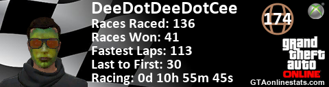 [URL=http://GTAonlinestats.com/showplayer/DeeDotDeeDotCee][IMG]http://GTAonlinestats.com/racesignature/DeeDotDeeDotCee/sig.png[/IMG][/URL]