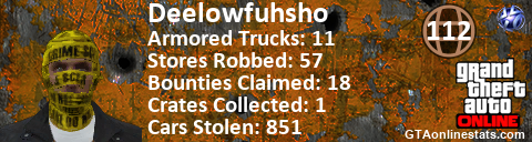 [URL=http://GTAonlinestats.com/showplayer/Deelowfuhsho][IMG]http://GTAonlinestats.com/crimesignature/Deelowfuhsho/sig.png[/IMG][/URL]