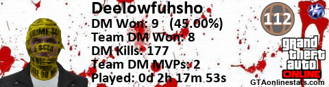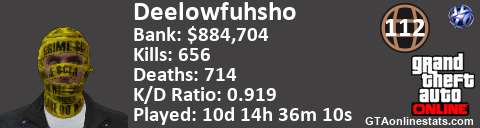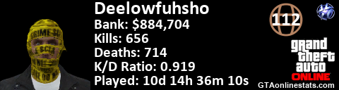 <a href="http://GTAonlinestats.com/showplayer/Deelowfuhsho"><img src="http://GTAonlinestats.com/dmsignature/Deelowfuhsho/sig.png" alt="Deelowfuhsho" border="0" /></a>