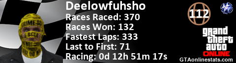 [URL=http://GTAonlinestats.com/showplayer/Deelowfuhsho][IMG]http://GTAonlinestats.com/racesignature/Deelowfuhsho/sig.png[/IMG][/URL]