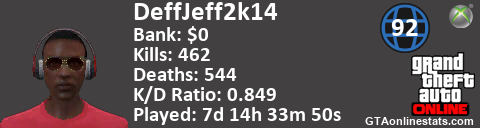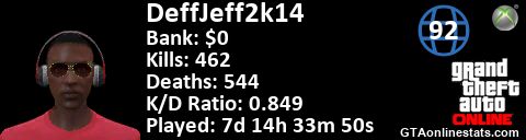 [URL=http://GTAonlinestats.com/showplayer/DeffJeff2k14][IMG]http://GTAonlinestats.com/signature/DeffJeff2k14/sig.png[/IMG][/URL]