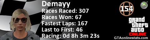 <a href="http://GTAonlinestats.com/showplayer/Demayy"><img src="http://GTAonlinestats.com/racesignature/Demayy/sig.png" alt="Demayy" border="0" /></a>