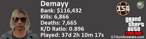 <a href="http://GTAonlinestats.com/showplayer/Demayy"><img src="http://GTAonlinestats.com/randomsignature/Demayy/sig.png" alt="Demayy" border="0" /></a>