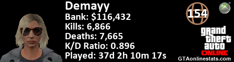 [URL=http://GTAonlinestats.com/showplayer/Demayy][IMG]http://GTAonlinestats.com/signature/Demayy/sig.png[/IMG][/URL]