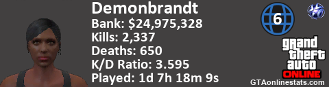 [URL=http://GTAonlinestats.com/showplayer/Demonbrandt/2][IMG]http://GTAonlinestats.com/dmsignature/Demonbrandt/2/sig.png[/IMG][/URL]