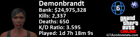 [URL=http://GTAonlinestats.com/showplayer/Demonbrandt/2][IMG]http://GTAonlinestats.com/signature/Demonbrandt/2/sig.png[/IMG][/URL]