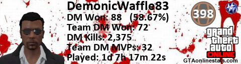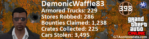 [URL=http://GTAonlinestats.com/showplayer/DemonicWaffle83][IMG]http://GTAonlinestats.com/signature/DemonicWaffle83/sig.png[/IMG][/URL]