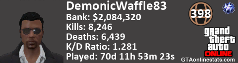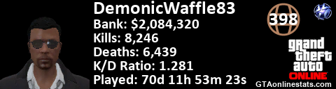 <a href="http://GTAonlinestats.com/showplayer/DemonicWaffle83"><img src="http://GTAonlinestats.com/randomsignature/DemonicWaffle83/sig.png" alt="DemonicWaffle83" border="0" /></a>