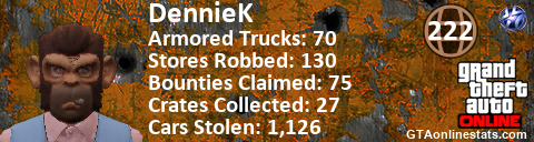 [URL=http://GTAonlinestats.com/showplayer/DennieK][IMG]http://GTAonlinestats.com/randomsignature/DennieK/sig.png[/IMG][/URL]