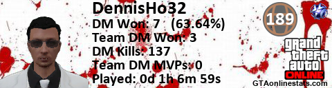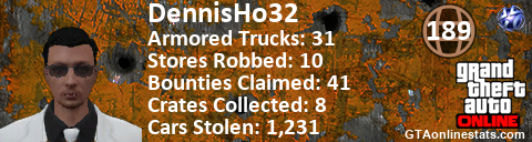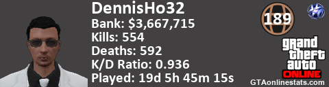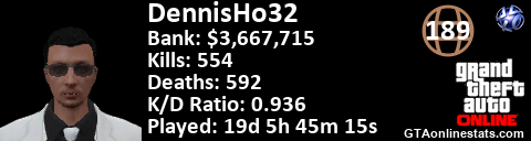 [URL=http://GTAonlinestats.com/showplayer/DennisHo32][IMG]http://GTAonlinestats.com/signature/DennisHo32/sig.png[/IMG][/URL]