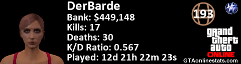 <a href="http://GTAonlinestats.com/showplayer/DerBarde"><img src="http://GTAonlinestats.com/dmsignature/DerBarde/sig.png" alt="DerBarde" border="0" /></a>