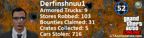 [URL=http://GTAonlinestats.com/showplayer/Derfinshnuu1][IMG]http://GTAonlinestats.com/randomsignature/Derfinshnuu1/sig.png[/IMG][/URL]