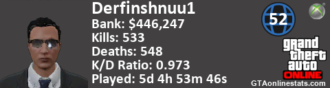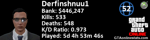 [URL=http://GTAonlinestats.com/showplayer/Derfinshnuu1][IMG]http://GTAonlinestats.com/signature/Derfinshnuu1/sig.png[/IMG][/URL]