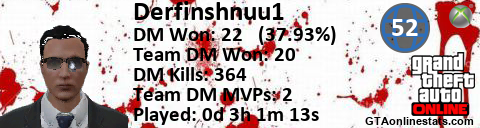 [URL=http://GTAonlinestats.com/showplayer/Derfinshnuu1][IMG]http://GTAonlinestats.com/dmsignature/Derfinshnuu1/sig.png[/IMG][/URL]
