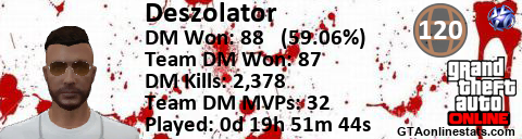 [URL=http://GTAonlinestats.com/showplayer/Deszolator][IMG]http://GTAonlinestats.com/dmsignature/Deszolator/sig.png[/IMG][/URL]