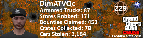 [URL=http://GTAonlinestats.com/showplayer/DimATVQc][IMG]http://GTAonlinestats.com/crimesignature/DimATVQc/sig.png[/IMG][/URL]
