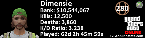 [URL=http://GTAonlinestats.com/showplayer/Dimensie/2][IMG]http://GTAonlinestats.com/signature/Dimensie/2/sig.png[/IMG][/URL]