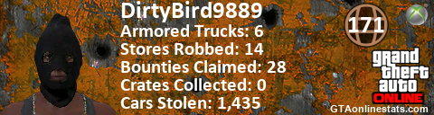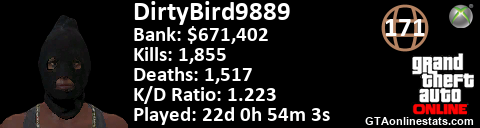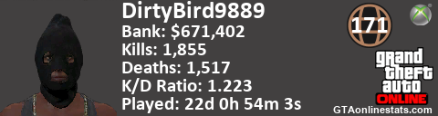 <a href="http://GTAonlinestats.com/showplayer/DirtyBird9889"><img src="http://GTAonlinestats.com/signature/DirtyBird9889/sig.png" alt="DirtyBird9889" border="0" /></a>