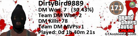 [URL=http://GTAonlinestats.com/showplayer/DirtyBird9889][IMG]http://GTAonlinestats.com/randomsignature/DirtyBird9889/sig.png[/IMG][/URL]