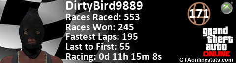 [URL=http://GTAonlinestats.com/showplayer/DirtyBird9889][IMG]http://GTAonlinestats.com/racesignature/DirtyBird9889/sig.png[/IMG][/URL]