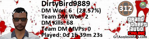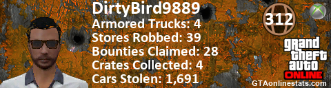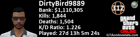 [URL=http://GTAonlinestats.com/showplayer/DirtyBird9889/2][IMG]http://GTAonlinestats.com/signature/DirtyBird9889/2/sig.png[/IMG][/URL]