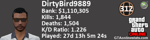 <a href="http://GTAonlinestats.com/showplayer/DirtyBird9889/2"><img src="http://GTAonlinestats.com/dmsignature/DirtyBird9889/2/sig.png" alt="DirtyBird9889" border="0" /></a>