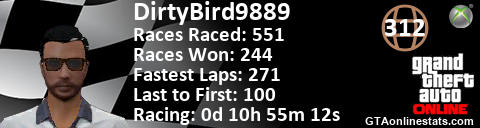 [URL=http://GTAonlinestats.com/showplayer/DirtyBird9889/2][IMG]http://GTAonlinestats.com/racesignature/DirtyBird9889/2/sig.png[/IMG][/URL]