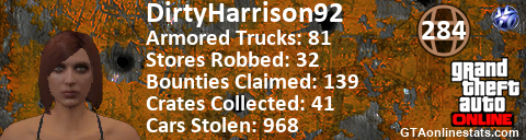[URL=http://GTAonlinestats.com/showplayer/DirtyHarrison92][IMG]http://GTAonlinestats.com/greysignature/DirtyHarrison92/sig.png[/IMG][/URL]