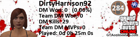 [URL=http://GTAonlinestats.com/showplayer/DirtyHarrison92][IMG]http://GTAonlinestats.com/dmsignature/DirtyHarrison92/sig.png[/IMG][/URL]