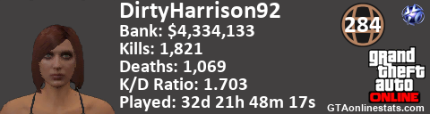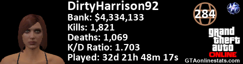 <a href="http://GTAonlinestats.com/showplayer/DirtyHarrison92"><img src="http://GTAonlinestats.com/dmsignature/DirtyHarrison92/sig.png" alt="DirtyHarrison92" border="0" /></a>