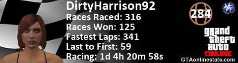 <a href="http://GTAonlinestats.com/showplayer/DirtyHarrison92"><img src="http://GTAonlinestats.com/racesignature/DirtyHarrison92/sig.png" alt="DirtyHarrison92" border="0" /></a>