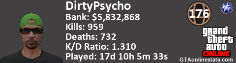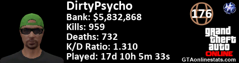 [URL=http://GTAonlinestats.com/showplayer/DirtyPsycho][IMG]http://GTAonlinestats.com/dmsignature/DirtyPsycho/sig.png[/IMG][/URL]