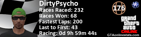 <a href="http://GTAonlinestats.com/showplayer/DirtyPsycho"><img src="http://GTAonlinestats.com/racesignature/DirtyPsycho/sig.png" alt="DirtyPsycho" border="0" /></a>