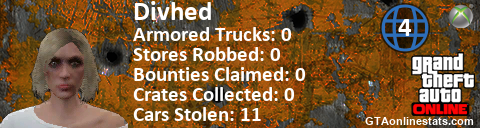 [URL=http://GTAonlinestats.com/showplayer/Divhed/2][IMG]http://GTAonlinestats.com/crimesignature/Divhed/2/sig.png[/IMG][/URL]