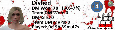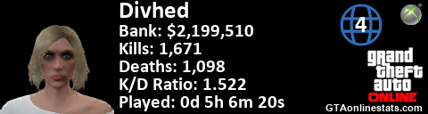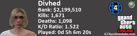 <a href="http://GTAonlinestats.com/showplayer/Divhed/2"><img src="http://GTAonlinestats.com/dmsignature/Divhed/2/sig.png" alt="Divhed" border="0" /></a>