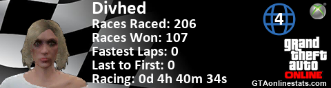 [URL=http://GTAonlinestats.com/showplayer/Divhed/2][IMG]http://GTAonlinestats.com/racesignature/Divhed/2/sig.png[/IMG][/URL]