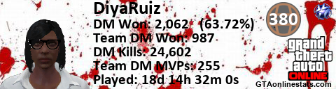[URL=http://GTAonlinestats.com/showplayer/DiyaRuiz][IMG]http://GTAonlinestats.com/dmsignature/DiyaRuiz/sig.png[/IMG][/URL]