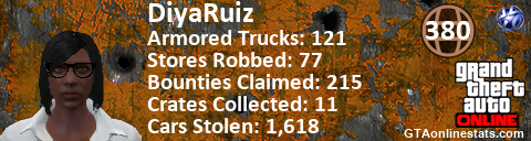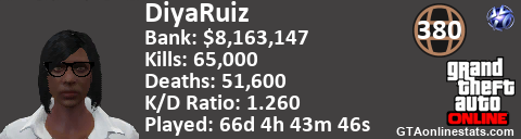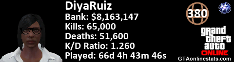 [URL=http://GTAonlinestats.com/showplayer/DiyaRuiz][IMG]http://GTAonlinestats.com/randomsignature/DiyaRuiz/sig.png[/IMG][/URL]