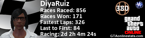 [URL=http://GTAonlinestats.com/showplayer/DiyaRuiz][IMG]http://GTAonlinestats.com/racesignature/DiyaRuiz/sig.png[/IMG][/URL]