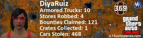 [URL=http://GTAonlinestats.com/showplayer/DiyaRuiz/2][IMG]http://GTAonlinestats.com/crimesignature/DiyaRuiz/2/sig.png[/IMG][/URL]