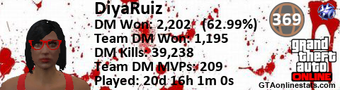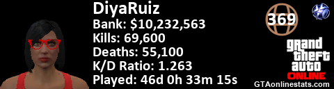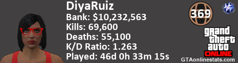 [URL=http://GTAonlinestats.com/showplayer/DiyaRuiz/2][IMG]http://GTAonlinestats.com/dmsignature/DiyaRuiz/2/sig.png[/IMG][/URL]