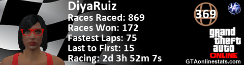 [URL=http://GTAonlinestats.com/showplayer/DiyaRuiz/2][IMG]http://GTAonlinestats.com/racesignature/DiyaRuiz/2/sig.png[/IMG][/URL]