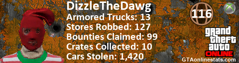 [URL=http://GTAonlinestats.com/showplayer/DizzleTheDawg][IMG]http://GTAonlinestats.com/crimesignature/DizzleTheDawg/sig.png[/IMG][/URL]