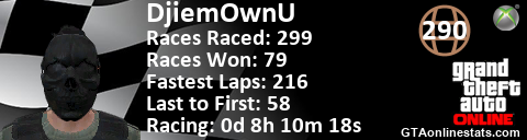 [URL=http://GTAonlinestats.com/showplayer/DjiemOwnU][IMG]http://GTAonlinestats.com/racesignature/DjiemOwnU/sig.png[/IMG][/URL]