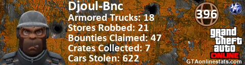 [URL=http://GTAonlinestats.com/showplayer/Djoul-Bnc/2][IMG]http://GTAonlinestats.com/crimesignature/Djoul-Bnc/2/sig.png[/IMG][/URL]