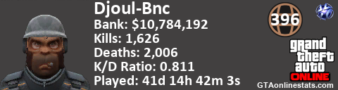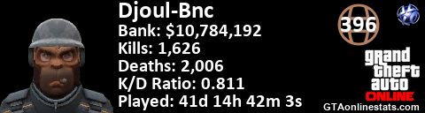 <a href="http://GTAonlinestats.com/showplayer/Djoul-Bnc/2"><img src="http://GTAonlinestats.com/signature/Djoul-Bnc/2/sig.png" alt="Djoul-Bnc" border="0" /></a>