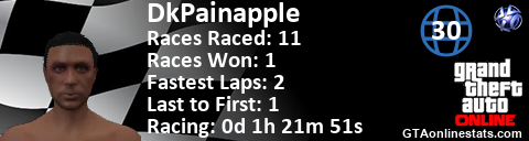 <a href="http://GTAonlinestats.com/showplayer/DkPainapple"><img src="http://GTAonlinestats.com/racesignature/DkPainapple/sig.png" alt="DkPainapple" border="0" /></a>