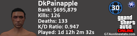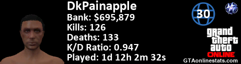 [URL=http://GTAonlinestats.com/showplayer/DkPainapple][IMG]http://GTAonlinestats.com/dmsignature/DkPainapple/sig.png[/IMG][/URL]