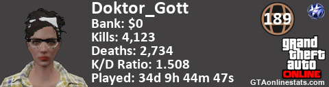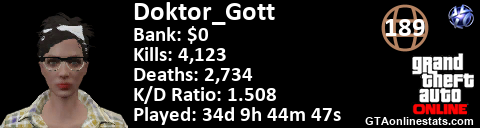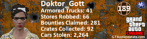 [URL=http://GTAonlinestats.com/showplayer/Doktor_Gott][IMG]http://GTAonlinestats.com/dmsignature/Doktor_Gott/sig.png[/IMG][/URL]