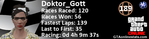 [URL=http://GTAonlinestats.com/showplayer/Doktor_Gott][IMG]http://GTAonlinestats.com/racesignature/Doktor_Gott/sig.png[/IMG][/URL]